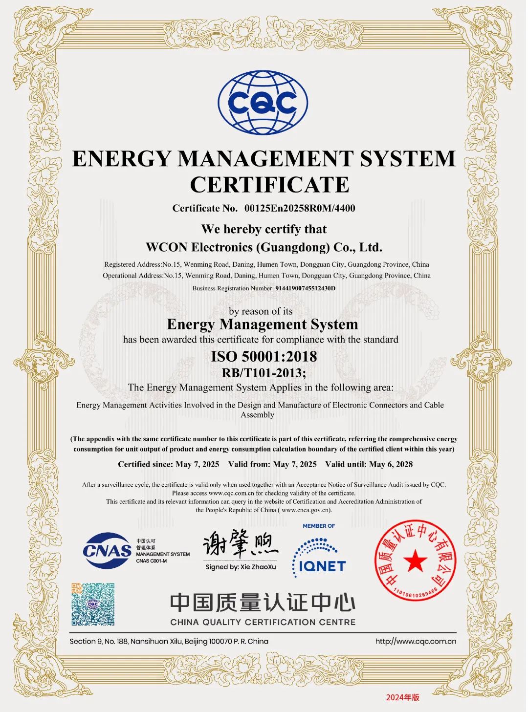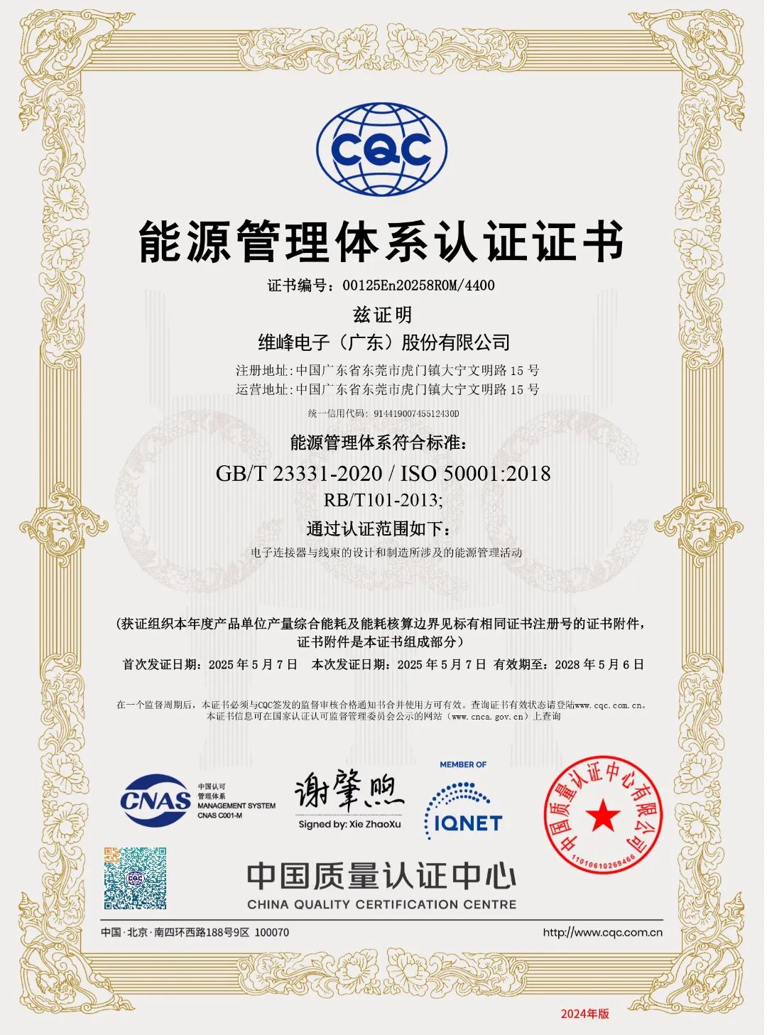 IQNET国际认证联盟是全球最具影响力的跨国认证网络,其34家权威机构成员覆盖33个国家和地区,颁发的认证证书被国际市场广泛认可。获得该认证为维峰电子全球化战略注入强劲动力,不仅强化了维峰电子在国际市场上的品牌信誉,更使其在全球化竞争中占据了先机,为吸引更多国际合作伙伴、拓展全球业务版图奠定了坚实基础。