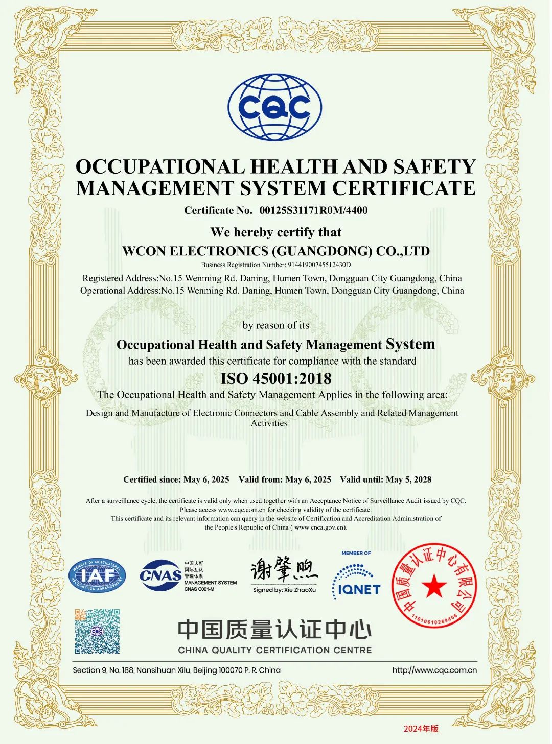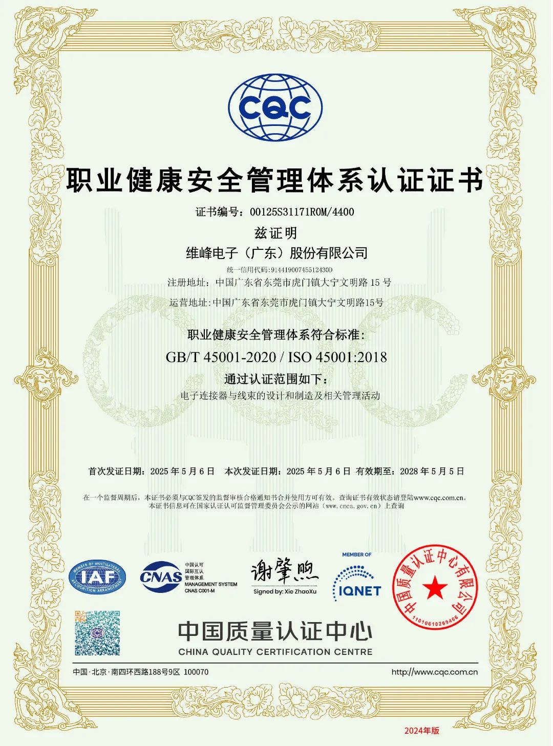 2025年5月,维峰电子(301328)接连斩获ISO45001职业健康安全管理体系认证、ISO5001能源管理体系认证及IQNET国际联盟认证,以中英文双版证书的权威背书,向全球市场递出一张闪亮的“企业名片”。这些认证不仅是对维峰电子管理体系国际化的认可,更是企业综合实力、社会责任与品牌价值的集中体现。